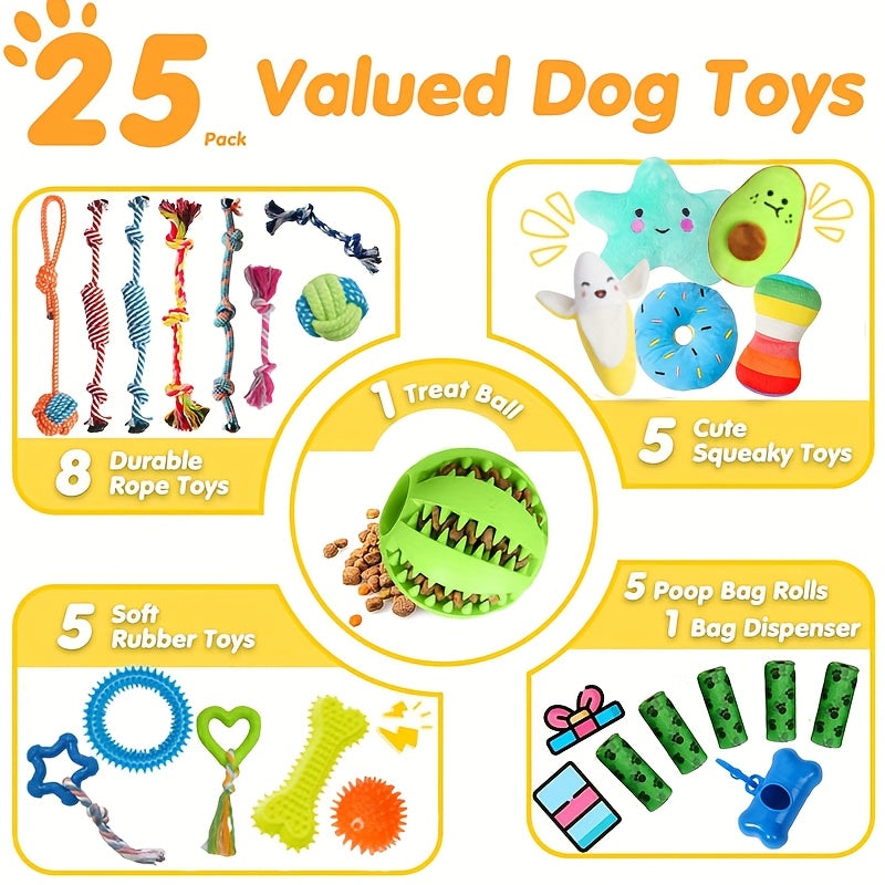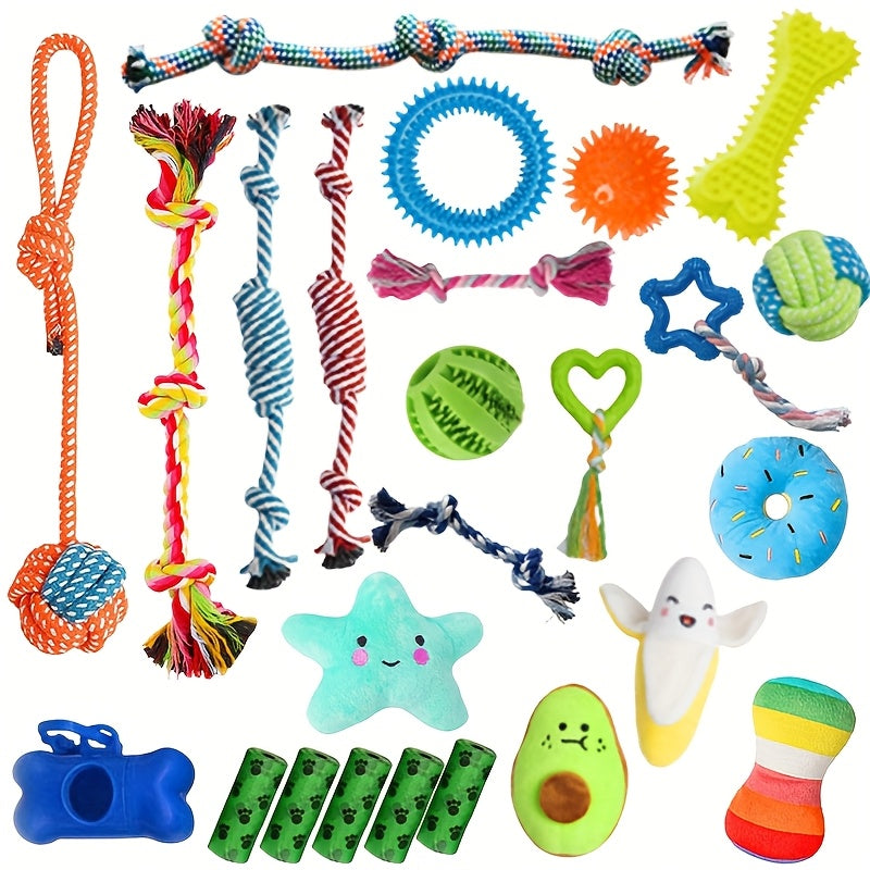 - Diverse Play Selection: Includes 8 durable rope toys, 5 squeaky plush toys, 5 rubber toys, 1 treat-dispensing ball, plus 5 rolls of dog waste bags and a convenient holder – all designed for interactive and stimulating play.