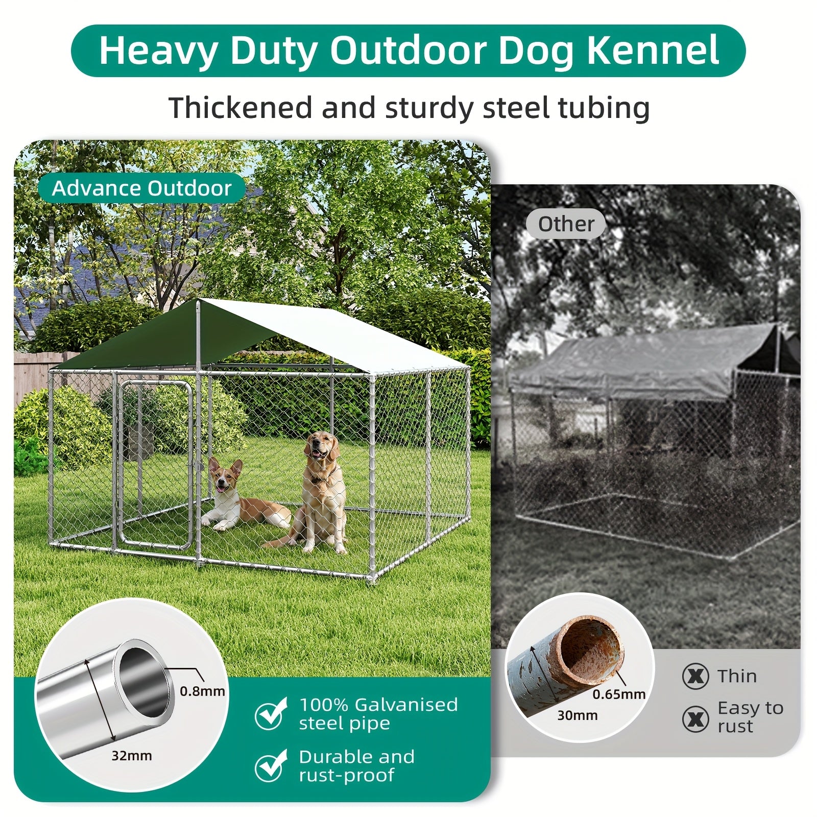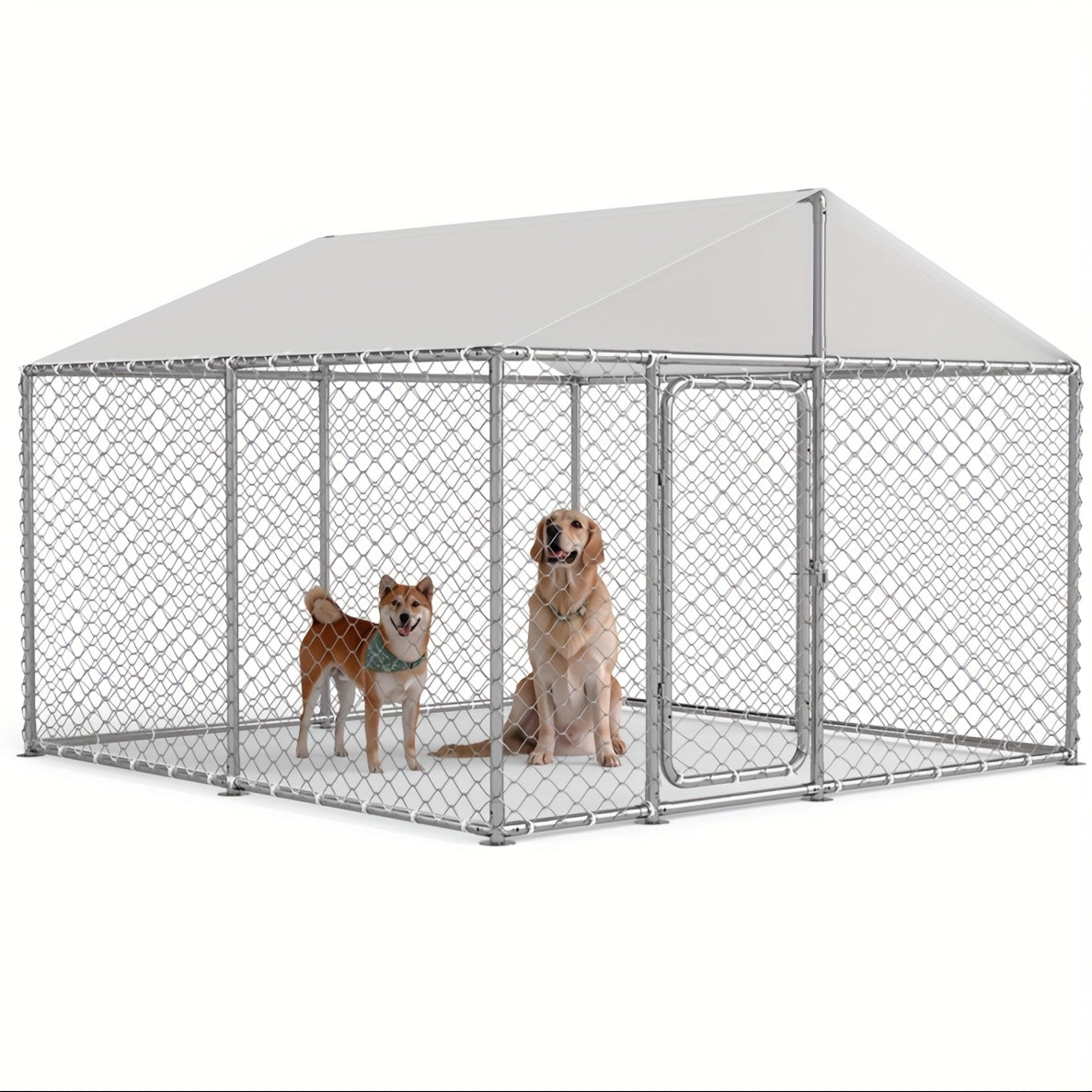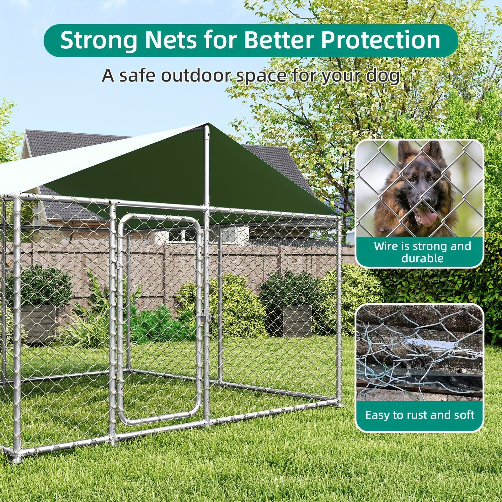Crafted from durable stainless steel, this kennel offers exceptional strength and longevity. Its waterproof and UV-resistant cover ensures that your pet stays dry and protected from harmful sun rays, making it ideal for all weather conditions.