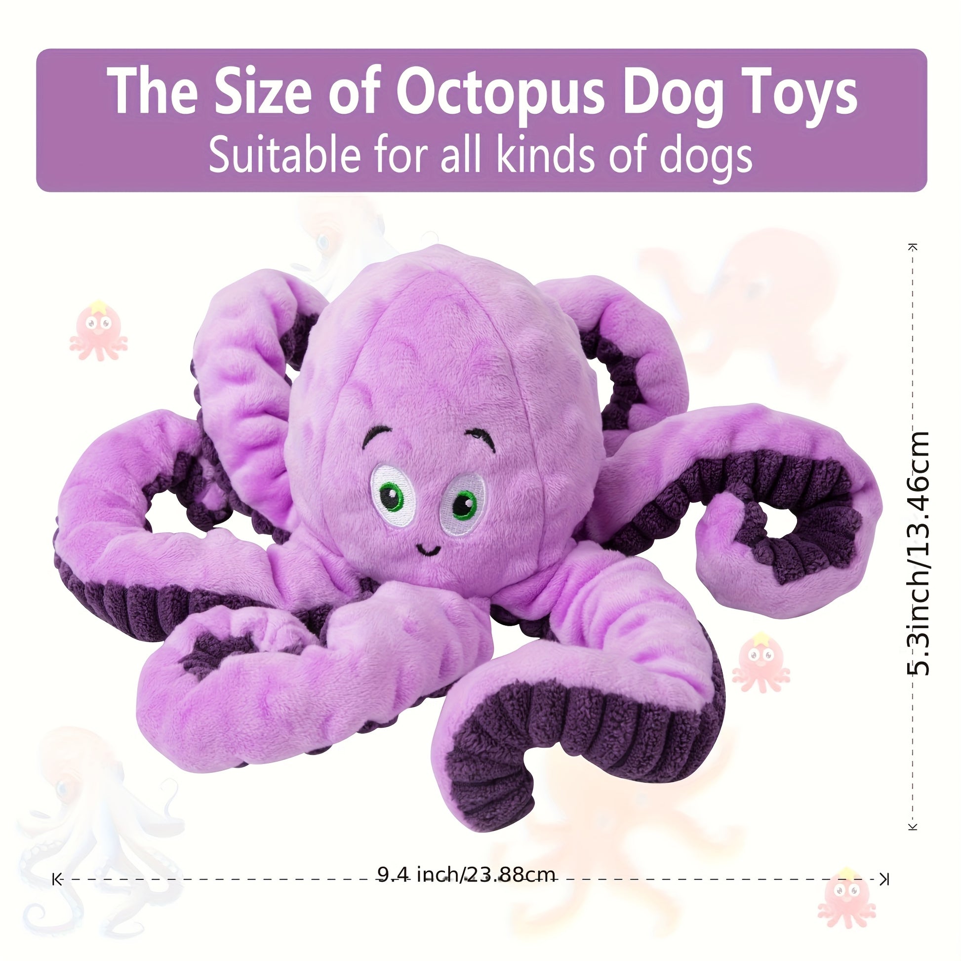 Delight your furry friend with the Interactive Squeaky Octopus Dog Toy, a perfect blend of fun and durability designed for dogs of all sizes, including large breed puppies. Crafted from a soft, plush cotton blend, this stuffed animal features vibrant purple tentacles that irresistibly attract your pet’s attention, encouraging hours of playful interaction.