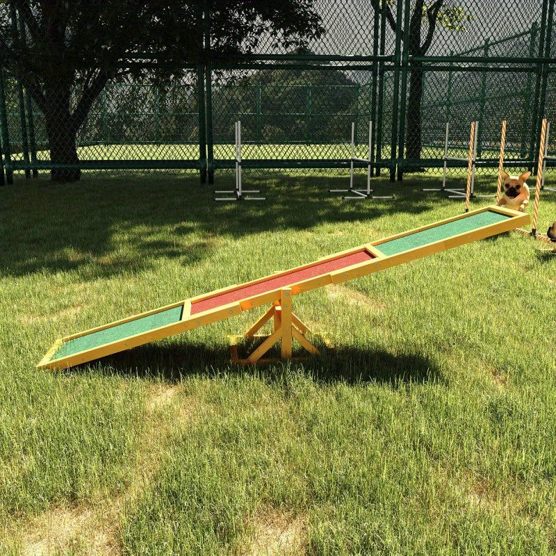 Measuring 71" L x 12" W x 12" H, this agility seesaw is perfect for dogs of all sizes and skill levels. Its natural wood finish seamlessly blends into any yard or park setting, making it an aesthetically pleasing addition to your pet's outdoor activities.